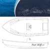 The GV17 is a vee hull garvey with plenty of deck space and reserve buoyancy. Her vee hull will allow smooth runs in choppy seas while the garvey hull shape gives unusual deck area and stability at slow speed. In the hands of the right skipper, she is offshore capable and fit to take engines up to 75 HP. This boat has an enormous capacity: see the displacement at the DWL: 2,500 lb.! This a big safety factor and in all versions, the cockpit is self-bailing. She can be made 100% unsinkable with the addition of buoyancy foam and upright flotation flooded is possible with foam under the gunwales and seats. This boat’s transom is designed for a standard 20″ shaft. The transom can easily be modified to accept other shaft lengths.